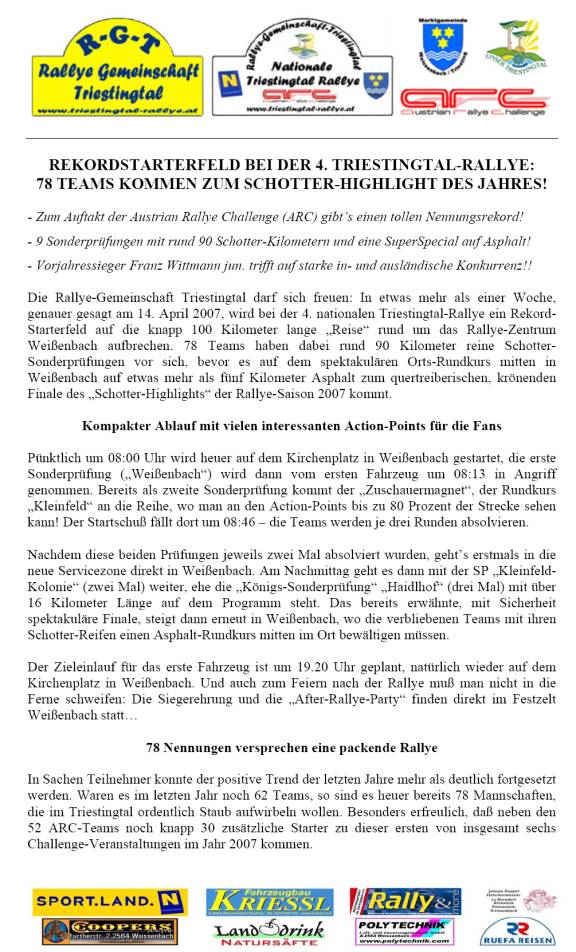 ARC: Triestingtal-Rallye | 15.04.2011Au revoir Tristesse, bonjour Triestingtal!Die große Saisonvorschau auf die Austrian Rally Challenge mit Fokus auf der Triestingtal-Rallye, die am Wochenende in Weißenbach steigt.Andreas Lugauer